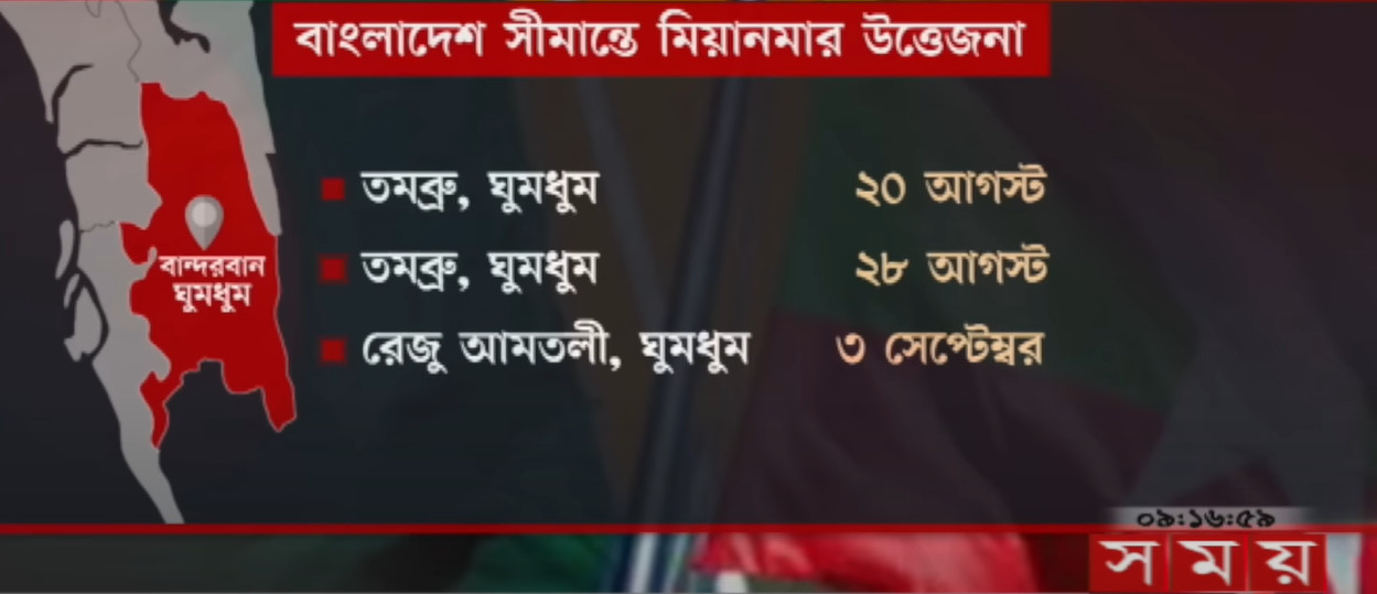 বাংলাদেশ সীমান্তে মিয়ানমারের উত্তেজনা এবং উস্কানি। প্রত্যেকটা দেশের জন্য একটি শূন্য এলাকা থাকে যেমন তেমনি বাংলাদেশের জন্য আছে। সেখানে মিয়ানমার সেনাবাহিনীর হেলিকপ্টার ঢুকে পরে বান্দরবানের ঘুমদুম এলাকায়। এলাকাবাসীর মতে তখন গোলাগুলির শব্দ শোনা যায় হেলিকপ্টার থেকে। মিয়ানমারের সীমান্ত এবং বাংলাদেশ সীমান্তের মাঝে একটা বড় জায়গা আছে। মিয়ানমার সেনাবাহিনীর হেলিকপ্টার বারবার সেই সীমান্ত রেখা অতিক্রম করে ফেলছে। এমনকি গত ৩ সেপ্টেম্বর সীমান্ত এলাকার ভিতরে গুলি এসে পড়েছে। এতে করে এলাকাবাসী আতঙ্কে দিন কাটাচ্ছে। সব করলে দেখা যায় গত ১৫ দিনের মধ্যে এটি চতুর্থ ঘটনা এর আগে তিনবার এই ধরনের ঘটনা ঘটায় মিয়ানমার সেনাবাহিনী।